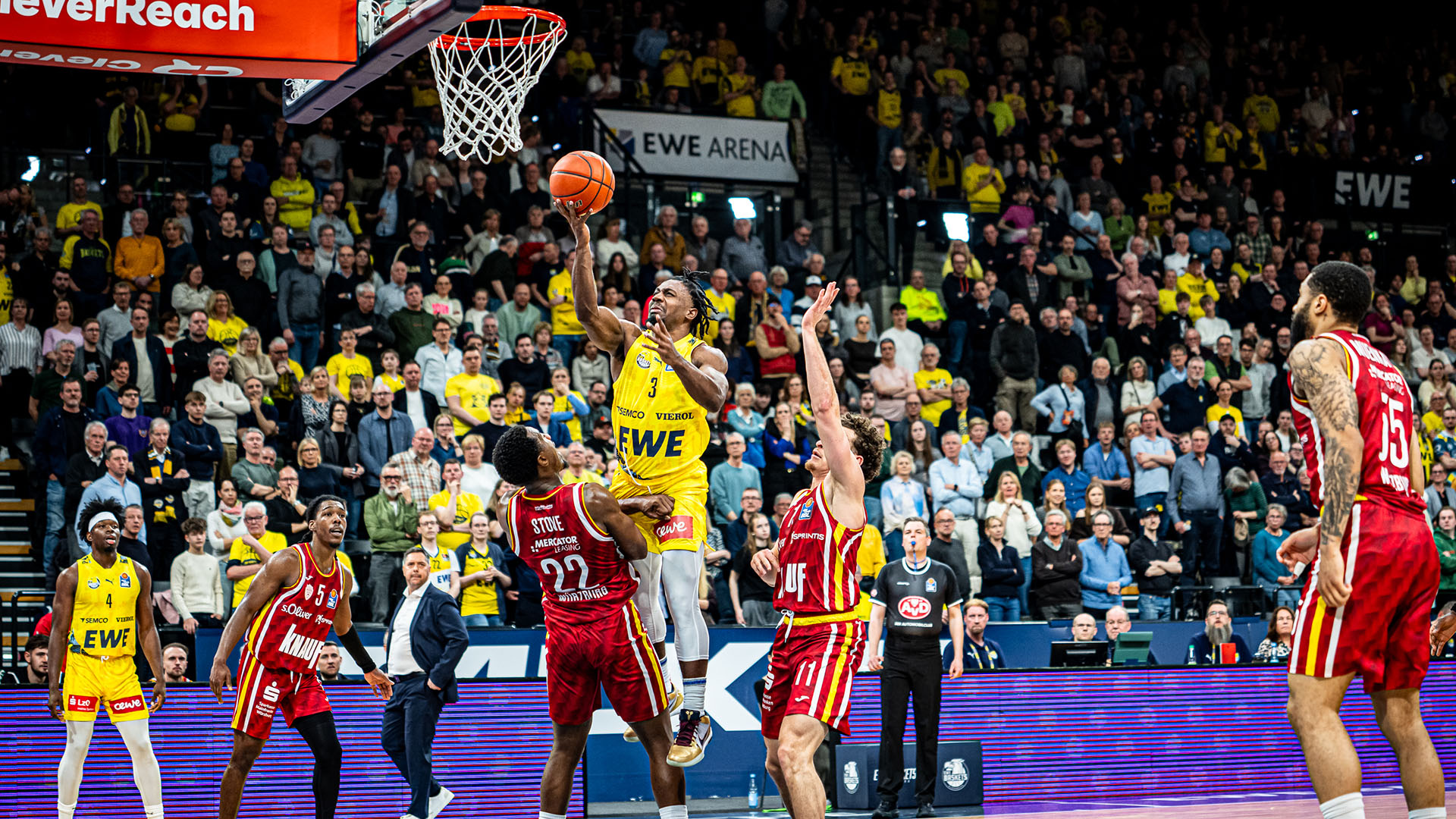 Auch im letzten Viertel blieb die Begegnung eng. Würzburg begann wichtige Würfe zu treffen, Nicholas Tischler hielt mit starken Offensivrebounds dagegen. Aus einer zweiten Chance schloss Tischler trotz eines Fouls ab und glich zum 77:77 aus. Carr und Ivey trafen für Würzburg, das sich auf 80:74 absetzte, nun gute Entscheidungen. Auf der Gegenseite zog Chris Clemons zum Korb, der folgende Zusammenprall wurde als Würzburger Foul bewertet. Das Dreipunktspiel schien auf 77:80 zu verkürzen, nach einer Coaches-Challenge allerdings drehten die Schiedsrichter die enge Entscheidung in ein Offensivfoul. Den EWE Baskets gelang es in der verbleibenden Spielzeit nicht mehr, der Partie eine Wende zu geben.
